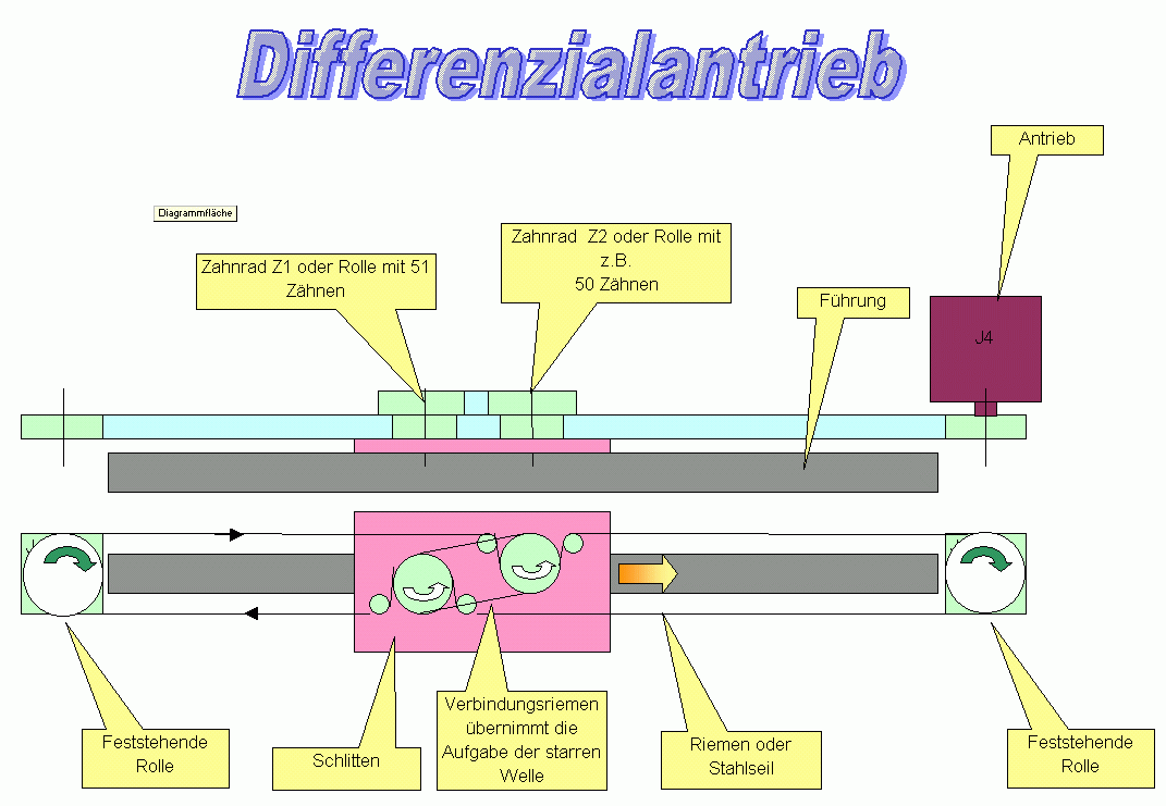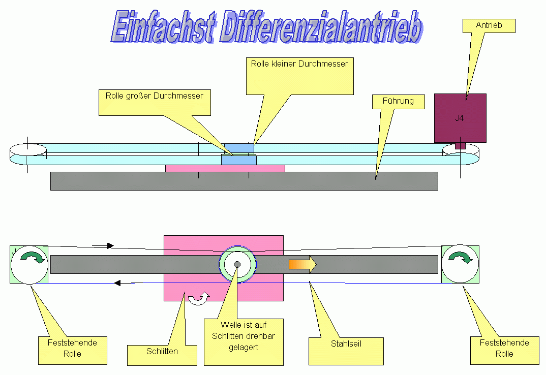 ich möchte euch hier eine neue Idee zum Antrieb von NC-Achsen vorstellen, den ich "Differenzialantrieb" getauft habe. Der Antrieb beruht auf dem Prinzip eines abgewandelten Differenzial-Flaschenzugs. Der Vorteil liegt darin, daß keine komplizierten Bauteil verwendet werden und das der Motor steht. Der Schlitten kann somit kleiner und leichter werden, was zu höheren Beschleunigungen führt.