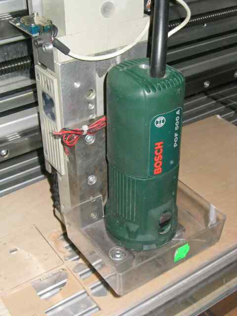 Als Frässpindel verwendet man eine Oberfräse aus dem Baumarkt mit Standardanschluß ø43mm. Die gezeichnete Halterung ist optimal an die Bosch Oberfräse angepaßt. Man sollte bei der Auswahl der Maschine darauf achten, daß die Spindel bei Höchstdrehzahl nicht zu laut ist und daß sie sehr hohe Drehzahl (bis ca. 30000 1/min) hat. Diese sind unentbehrlich bei Verwendung von Hartmetallfräsern mit keinen Durchmessern, wie sie z.B. die Firma Conrad günstig anbietet. Da meist sehr kleine Fräser (ø<3mm) zum Einsatz kommen ist es wichtig, daß Spannzangen in den unterschiedlichen Durchmessern angeboten werden (ø3; ø3,17; ø 6; ø8). Spannzangen sind aufgrund der höheren Rundlaufgenauigkeit besser geeignet als Bohrfutter. Da die Spindel auf der Maschine sehr langem Dauerlauf ausgesetzt ist sollte man auf gute Qualität und wechselbare Kohlen wert legen. Eine gute Maschine ist z.B. die Oberfräse der Firma Kress.