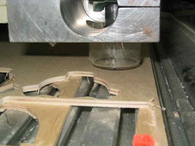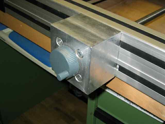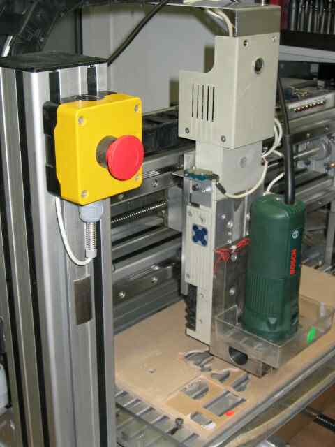 Alle Antriebe bleiben sofort stehen. Leider läuft die Spindel der Oberfräse noch nach. Dies läßt sich nicht verhindern, da auf eine käufliche Oberfräse ohne Bremse zurückgegriffen wird.