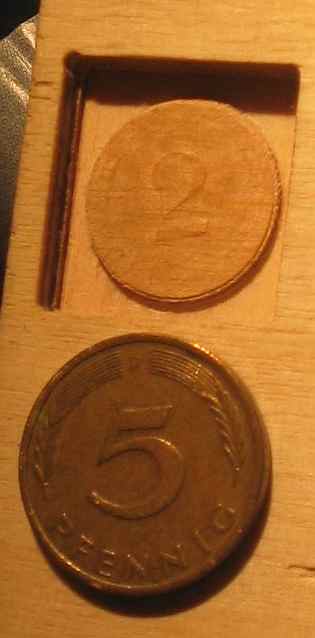 Am Anfang jeder Fräsarbeit steht das Referenzieren des Systems. Das bedeutet, daß alle Achsen zunächst ihren Nullpunkt suchen müssen, denn wir haben kein Absolutmeßsystem in unserer Maschine integriert. Als nächstes muß der Fräser "ankratzen". Man schaltet sich die Koordinatenanzeige ein (F2) und fährt mit dem Fräser von Hand (F7) über das Werkstück Den Fräser positioniert man mit Einzelschritten so, daß er gerade das Werkstück berührt. Den Tiefenwert (z.B. –45.250mm) trägt man als z-Wert beim Nullpunkt ein (ist immer negativer Wert! Vgl. Koordinatensystem).