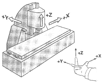 Die Steuerung geht davon aus, daß die Achsen in dieser Reihenfolge und in der geforderten Richtung angeorndet sind und ein Verfahren in positive Richtung auch entsprechend der Skizze ausgeführt wird. Bei meiner Maschine führte dies dazu daß der Koordinatenursprung vorne am linken Maschinentischrand liegt und daß eine Zustellung in negative z-Richtung erfolgt. Daran muß man sich erst gewöhnen.