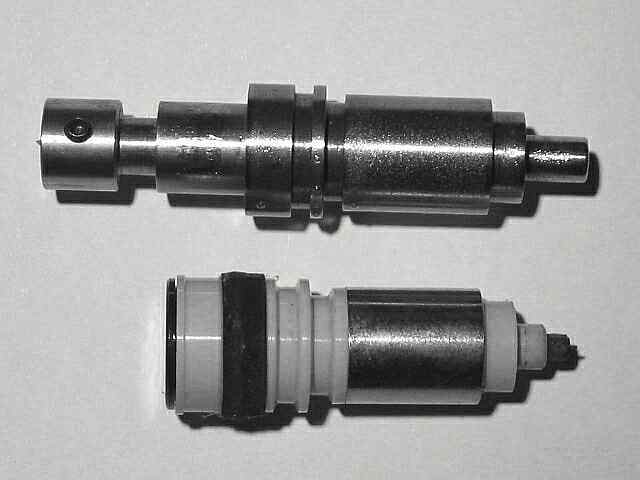 Schleppmesser im Vergleich mit einem Standardplotterstift. Mit der Madenschraube links wird das Messer geklemmt.