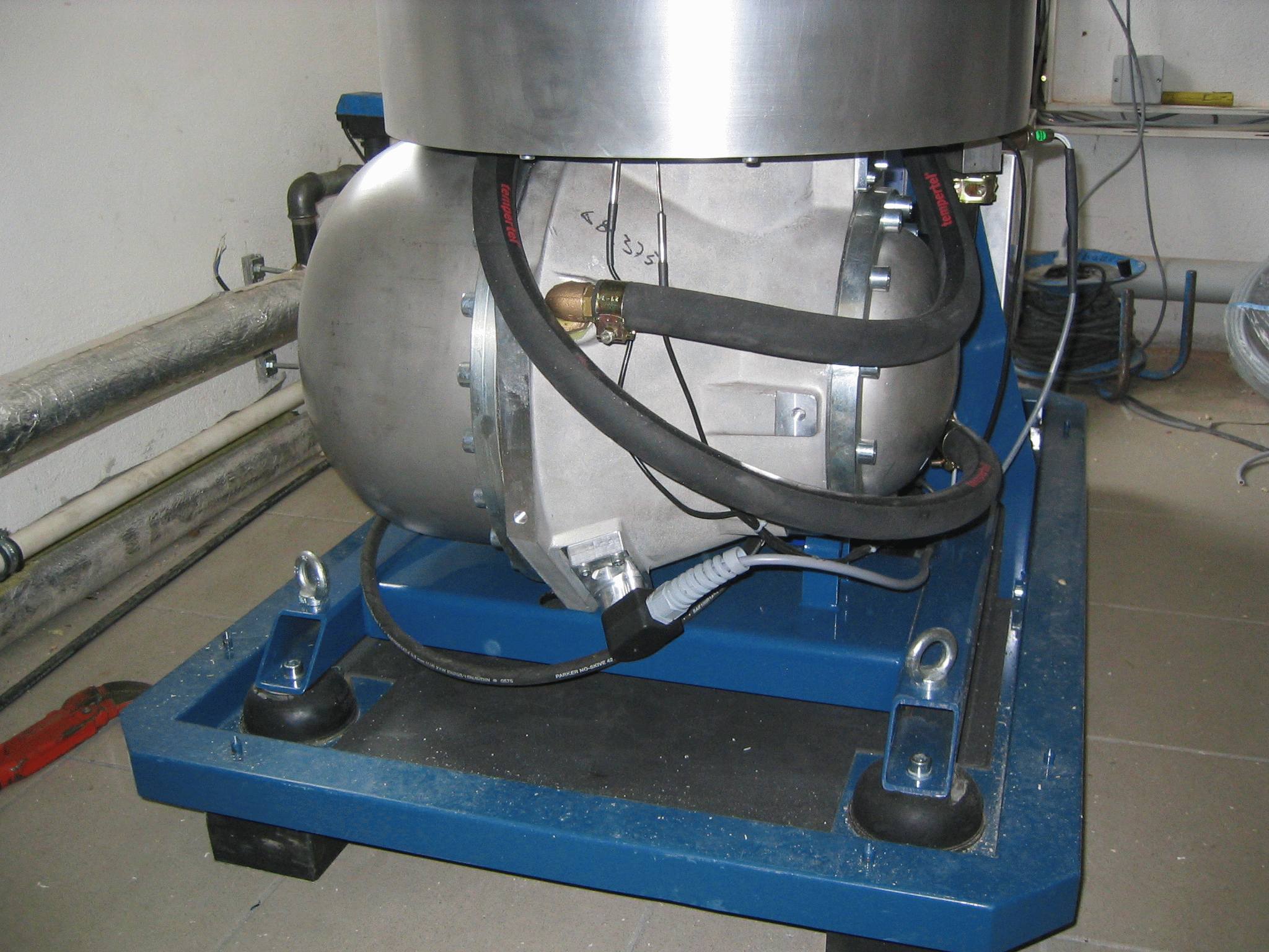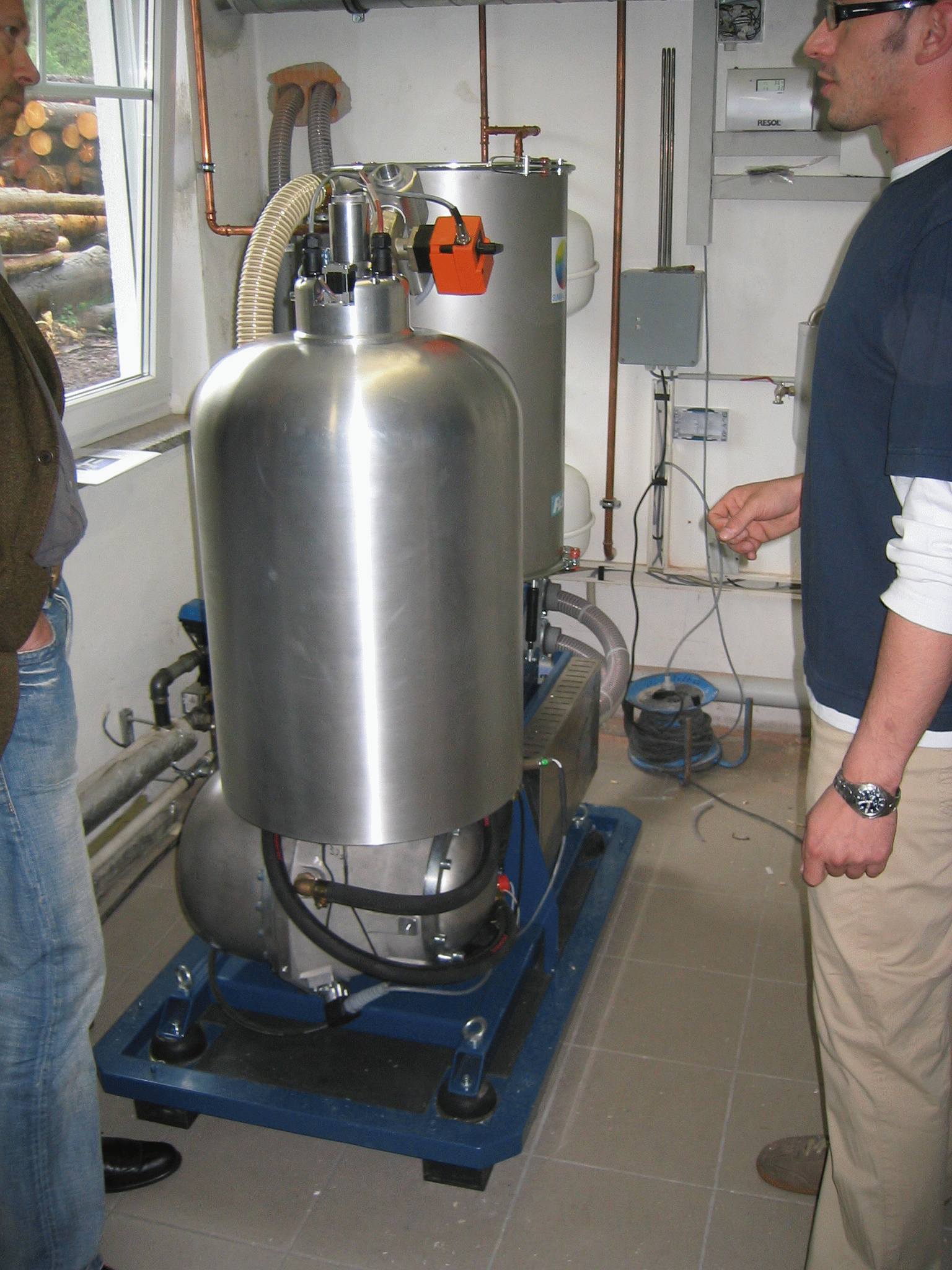 Die sunmachine® ist größer als ich dachte und mit 350kg auch nicht unbedingt ein Leichtgewicht. Man sieht es im Größenvergleich zu den Personen.Im Vordergrund ist der Motor zu erkennen und im Hintergrund der Tagesvorratsspeicher. |
