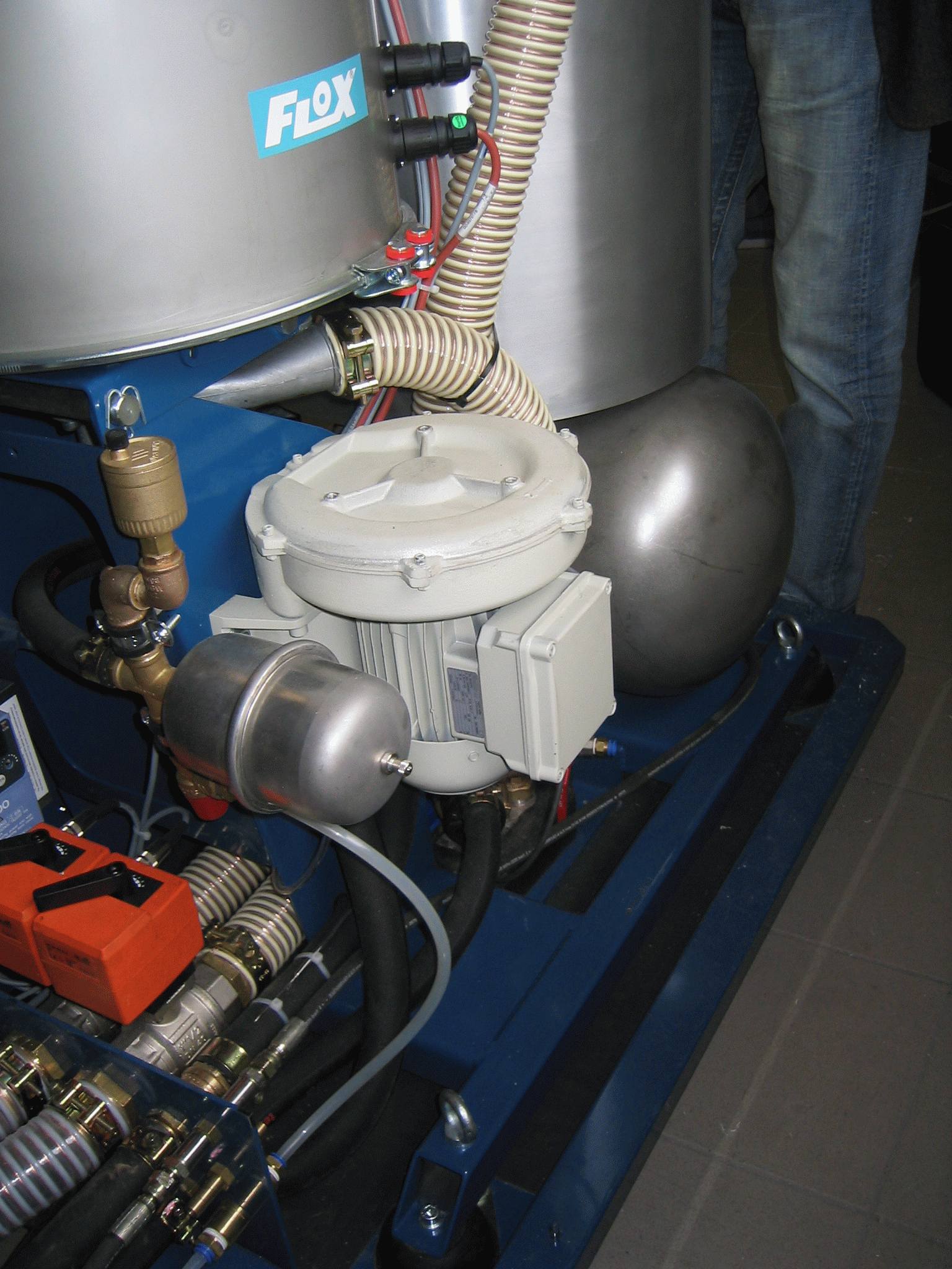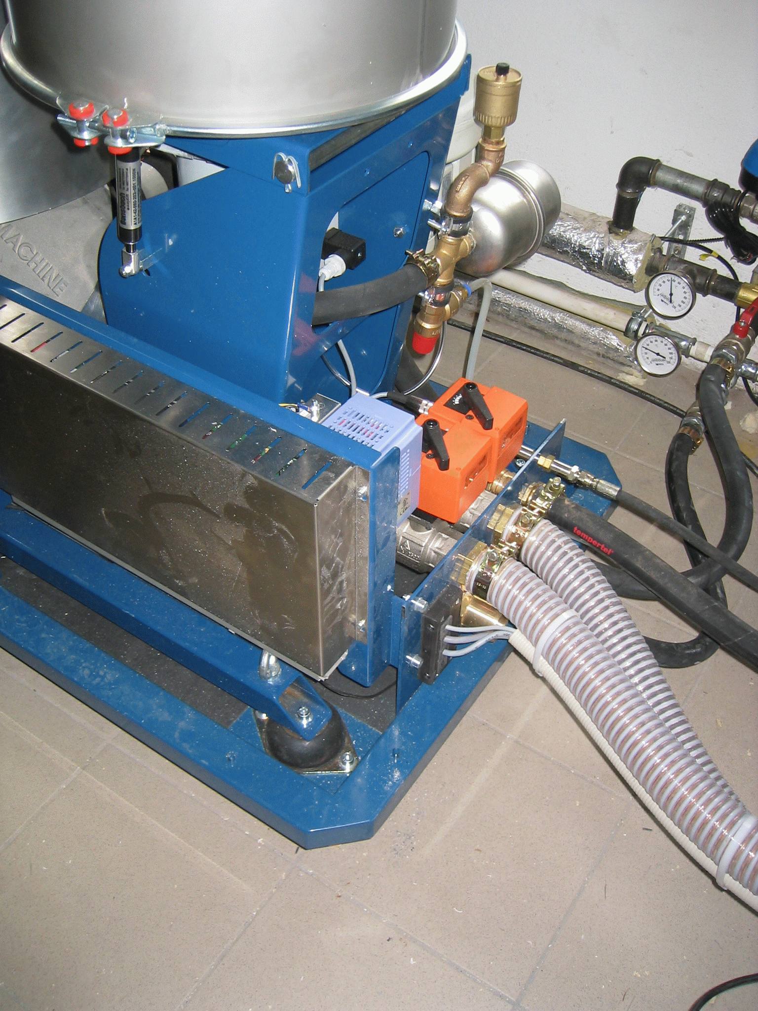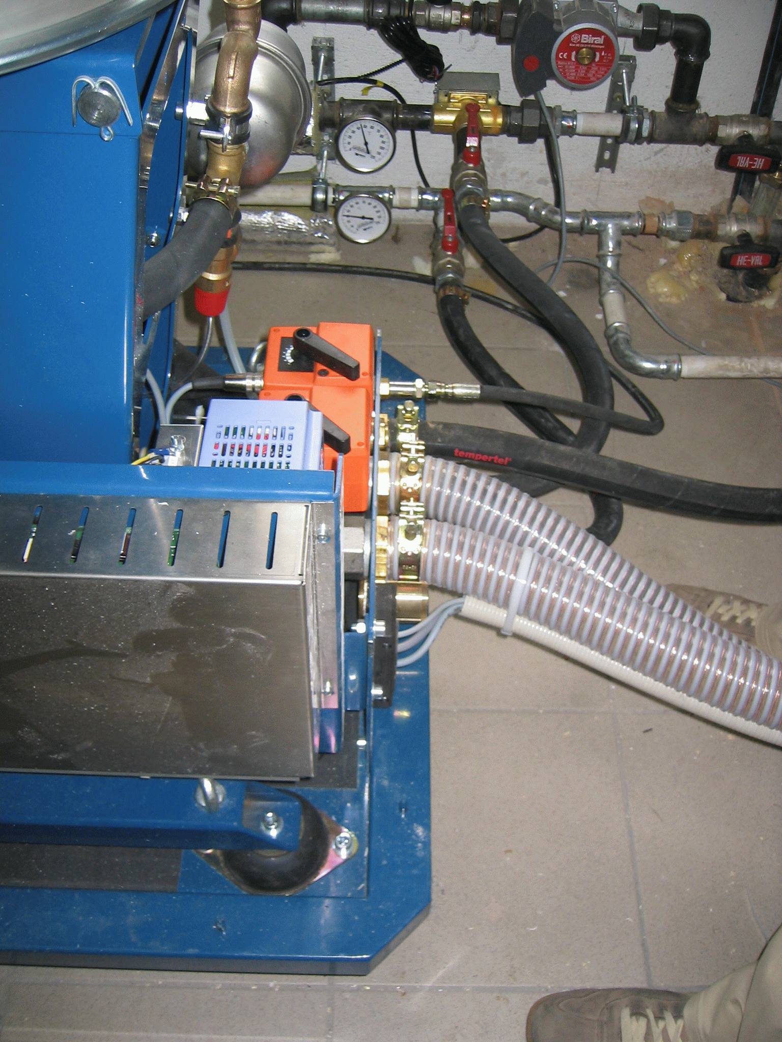 Die Maschine wir über ein Schlauchsystem und ein Gebläse mit Pellets automatisch versorgt.